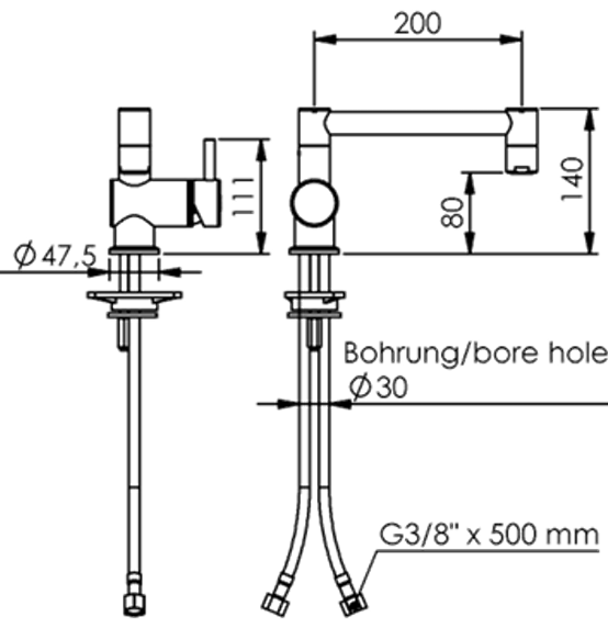 - Anschlussschläuche: 2 × 500 mm, 3/8"